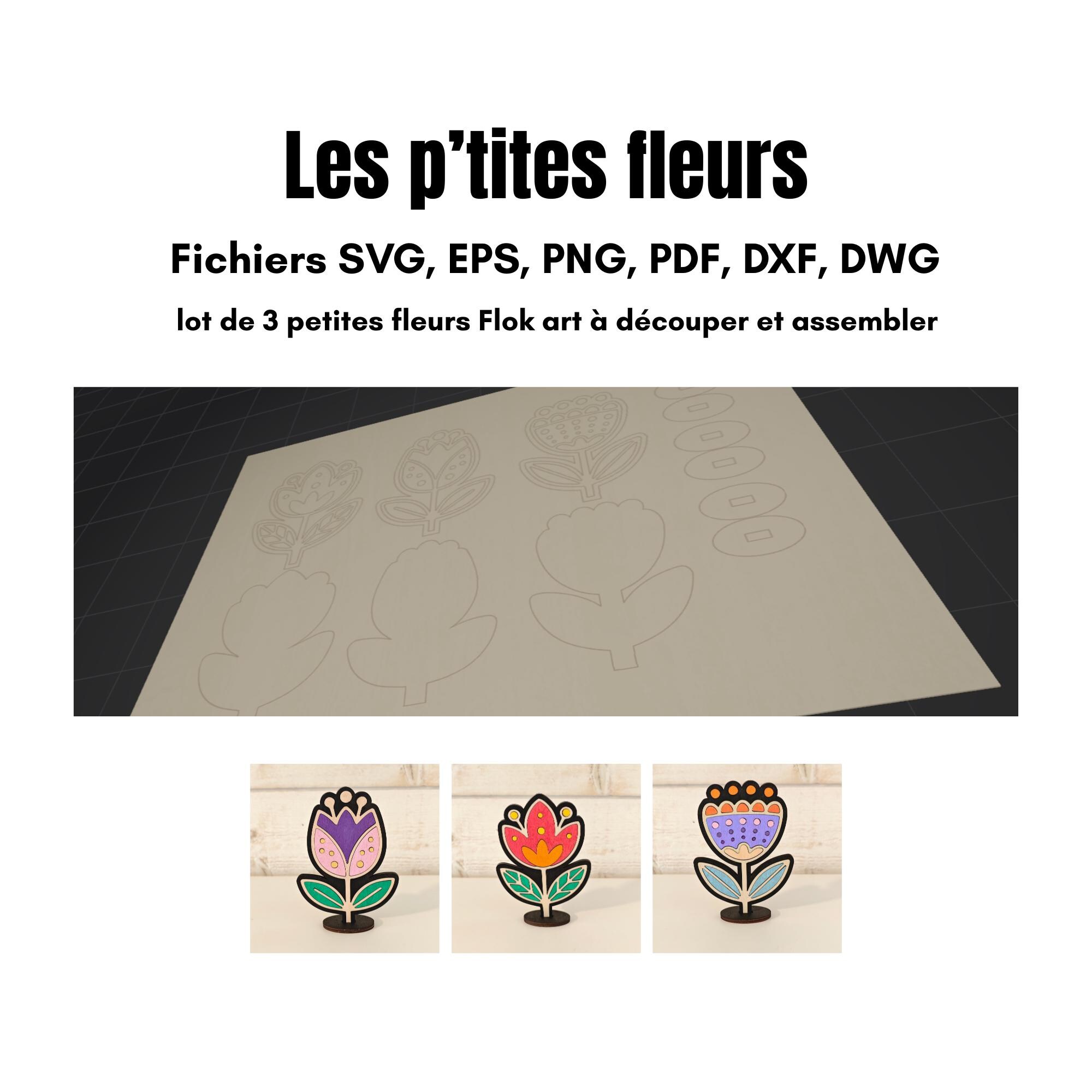 Le dossier Zip comprend les fichiers suivants : SVG, PDF, PNG, EPS, DXF, DWG (deux épaisseurs de bois sont prévues pour la découpe laser sur bois comme sur les images